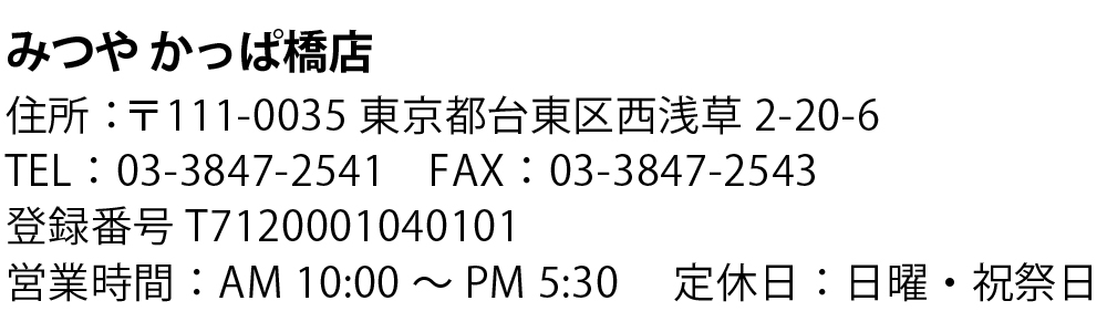 このショップは株式会社みつや かっぱ橋店が運営する通販ウェブショップです。 レジスターやオーダリングシステムをはじめ、タイムレコーダー、お会計伝票、メニューブック等、主に飲食店舗用品を取り揃えたショップです。 店頭では実際に「見て」「さわって」お選びいただけるレジスターの実機サンプルや、その他店舗用品も実際にお手に取りながらご覧いただけます。 その他にも写真撮影、撮影した写真を活かした各種印刷物の制作まで、幅広い商材をご用意しております。 皆様のご来店をお待ちしております。 大きな地図で見る